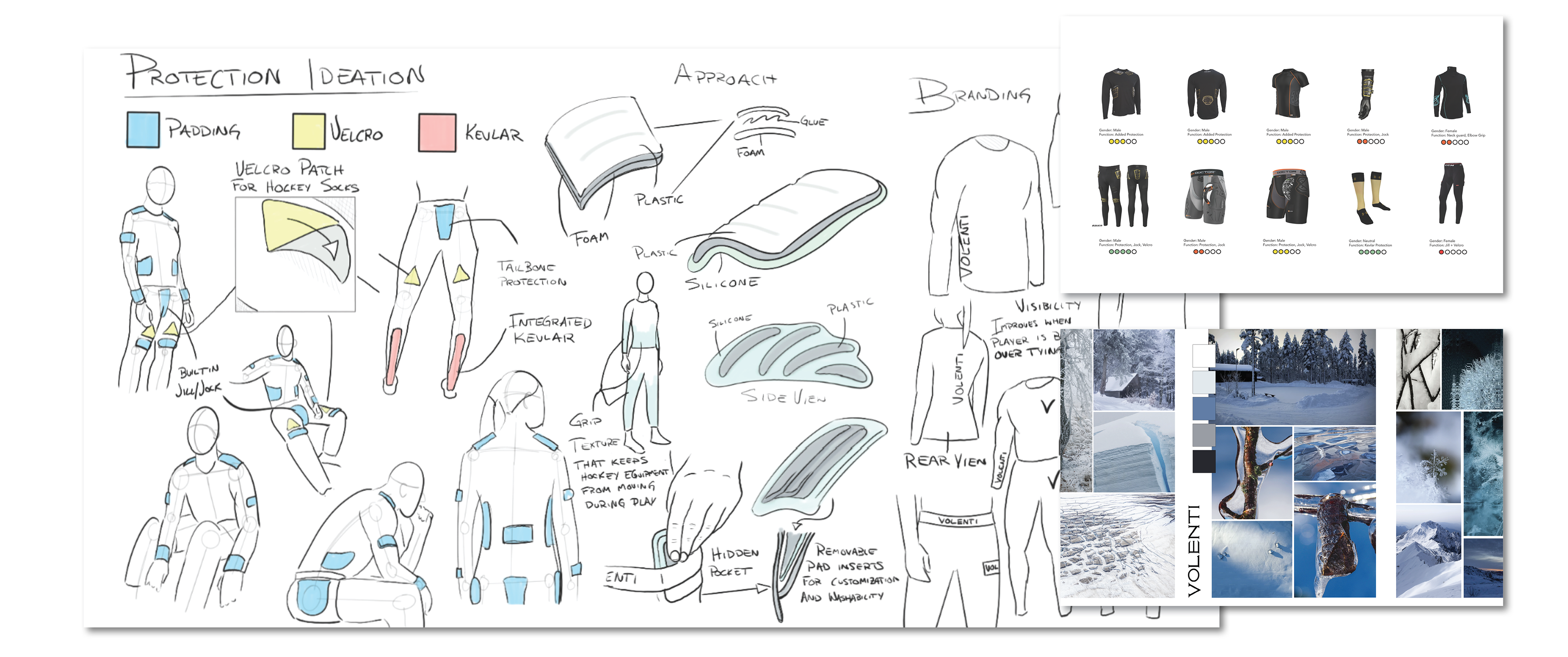 Currently, there are ice hockey brands who have attempted to create base layer apparel with extra padding but most are for the male gender. The majority of the products are not designed to withstand being laundered and tend ti easily deteriorate over time. This product line aims to design an inclusive apparel line that protects the player, is durable, can be machine washed while being aesthetically inspired by the cold hues in nature during the winter months.