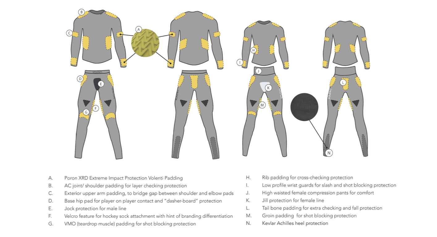 Volenti Protective Apparel Line is a function apparel line for competitive hockey players ages 12 and up of all genders that provides cut resistance, impact protection and Velcro in all the necessary areas.