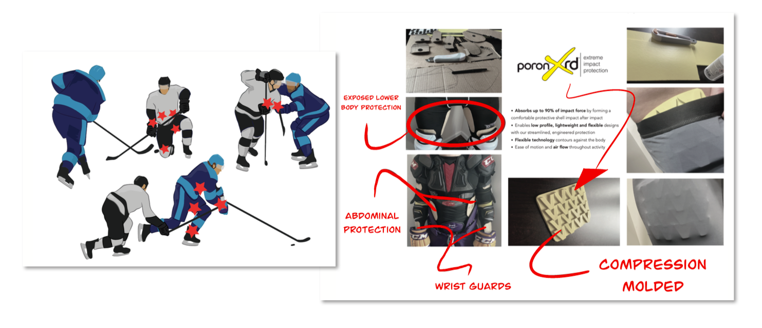 Blocking shots, physical contact between players and stick play are just some of the instances where a player cane be injured while playing. By analyzing the interactions and studying physical gabs in equipment, this protective apparel line will appropriately protect players from future or existing bumps and bruises.